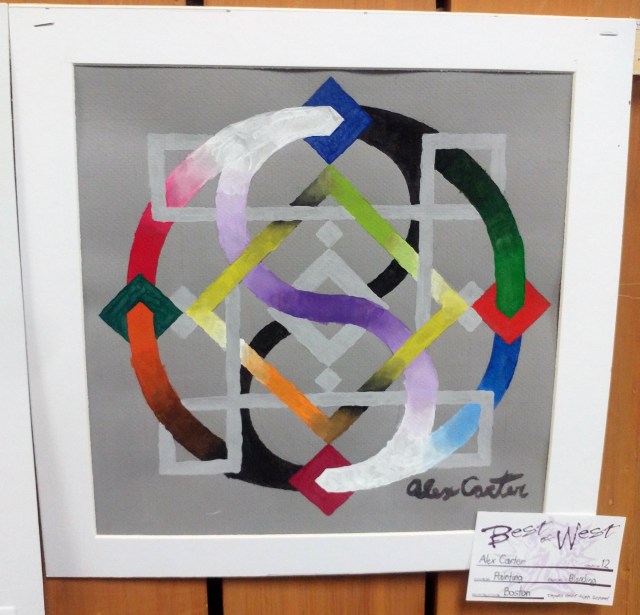 Description: A geometric painting made for my high school Painting class using all twelve colors on the color wheel and blending techniques.