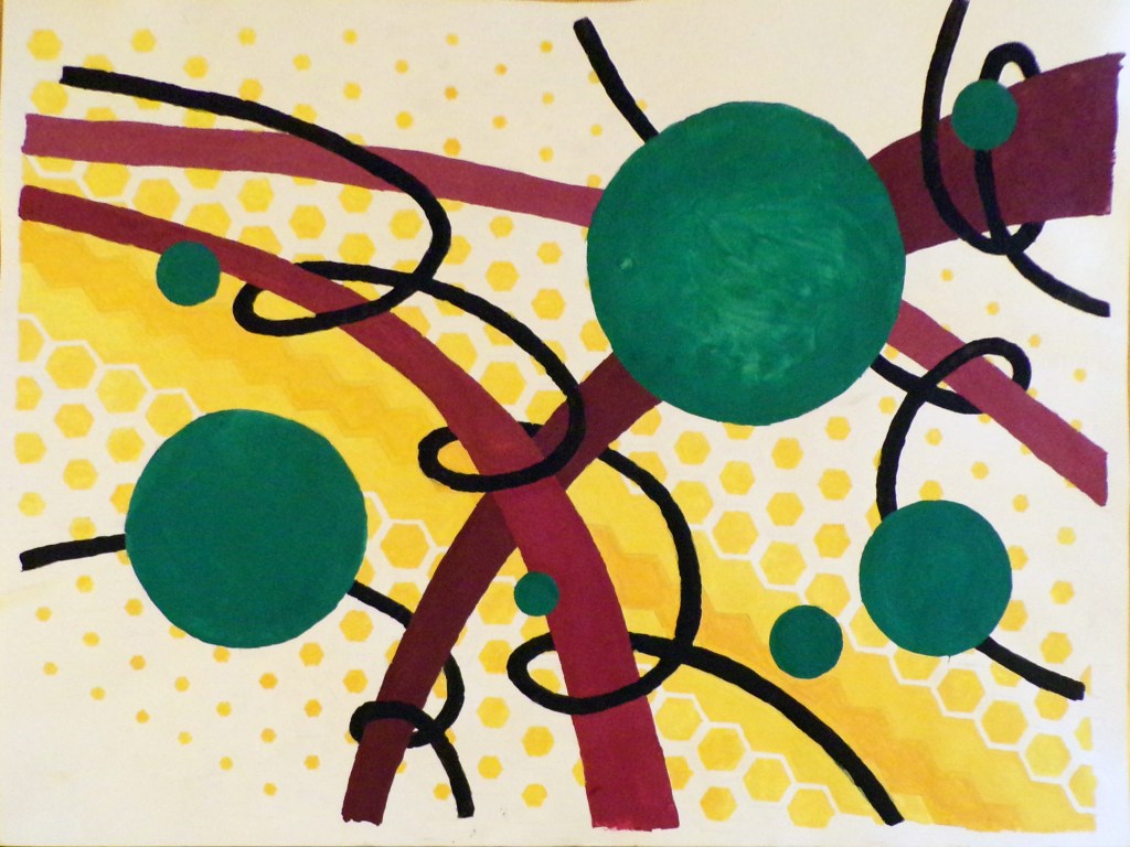 Description: An abstract painting made for my college 2D Design class using different shades of red-violet, yellow-orange, and blue-green.